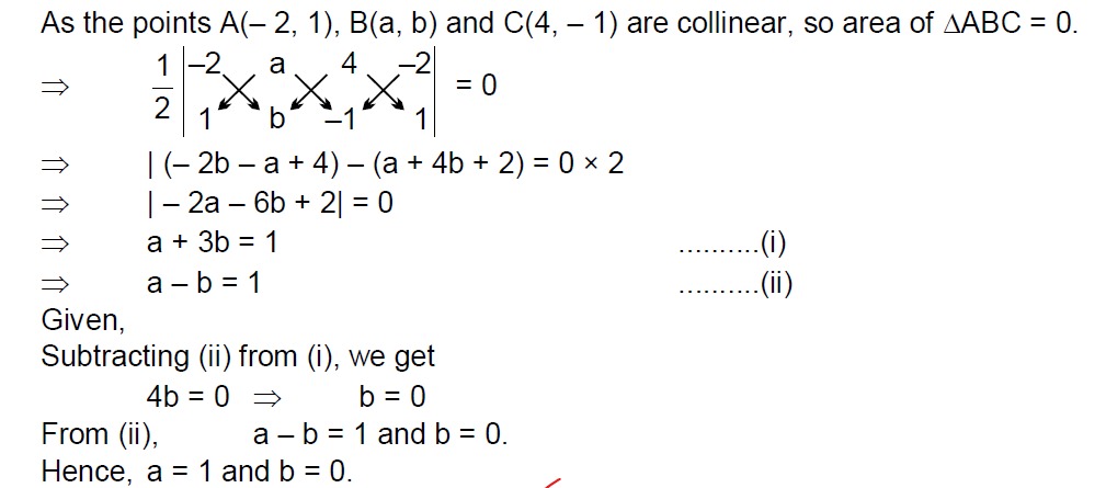 - If the points (– 2, 1), (a, b) and (4, – 1) are collinear and a – b = 1, then find the values of a and b.